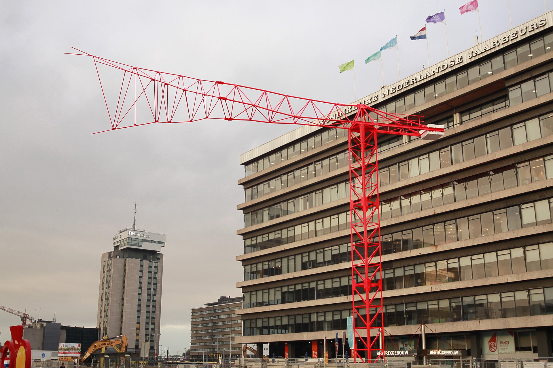 In an area so completely and totally under renovation, adorned with a skyline of tower cranes, this artwork of artist duo HeHe, Helen Evans (1972, United Kingdom) and Heiko Hansen (1970, Germany) might be overlooked during daytime. The work just seems to be part of the building site and the ever-changing environment. But the crane’s arm, which draws the background with its lightning shape, does not tell a story of construction, change and improvement but rather of explosion, degradation and a more savage, uncontrollable energy.